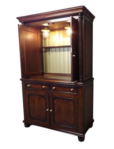 This elegant Ralph Lauren armoire has been thoughtfully converted into a stylish and functional coffee bar, blending timeless craftsmanship with modern convenience. Crafted from rich mahogany and finished in a warm, lustrous tone, the piece showcases beautifully figured veneer panels with striking grain patterns that create a refined, upscale presence. The classic design is enhanced by fluted spiral columns, crown molding, and traditional bracketed panel details, reflecting Ralph Lauren’s signature blend of sophistication and heritage style.
