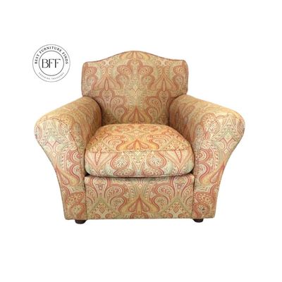 This Ralph Lauren upholstered lounge chair brings classic elegance and rich pattern into any space. The chair features a beautifully tailored paisley fabric in warm tones of gold, rust, and muted sage, giving it a timeless, heritage-inspired look that Ralph Lauren is known for. The gently curved back and substantial rolled arms create a comfortable, inviting silhouette, while the loose seat cushion adds to its relaxed yet refined feel.